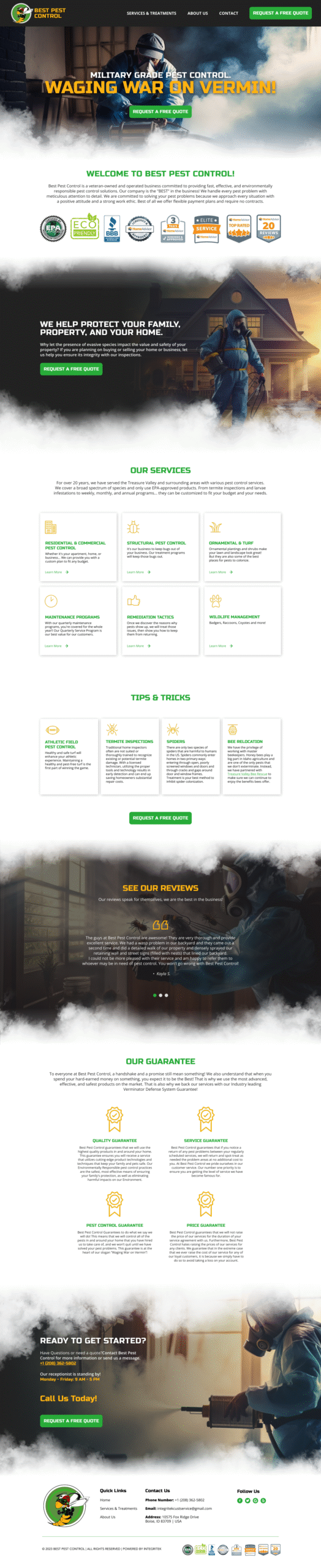 I designed a bold, high-impact website for Best Pest Control, built around strong visuals and military-themed branding to emphasize their message of “waging war on vermin.” The layout combines dramatic hero imagery, clear service highlights, and trust-building badges to immediately capture attention. With intuitive navigation, prominent calls-to-action, and engaging sections like tips, reviews, and guarantees, the design balances authority and approachability while guiding users seamlessly toward scheduling a service.