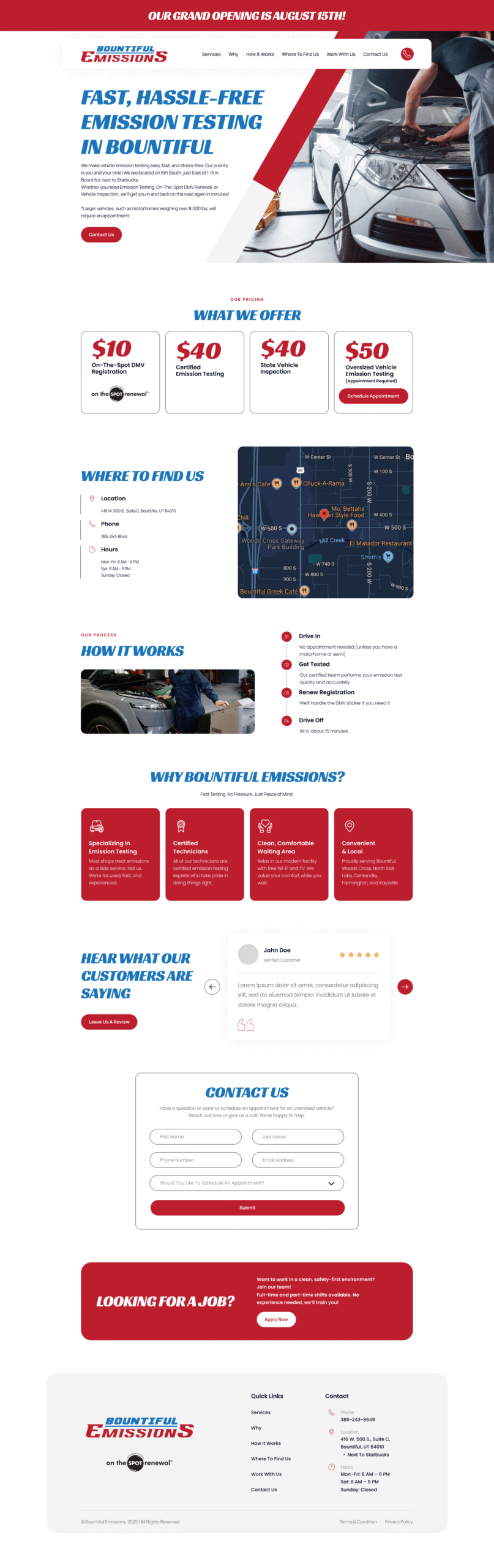 I designed a clean, user-friendly website that reflects the company’s promise of fast and stress-free vehicle emission testing. The site emphasizes clarity and efficiency, guiding users quickly to key services. I used a straightforward layout with bold headings, easy-to-read pricing, and a step-by-step “How It Works” section to make the process approachable and transparent to the user. The design also incorporates clear calls-to-action, modern typography, and a welcoming tone to build trust and highlight the convenience and speed of their services.