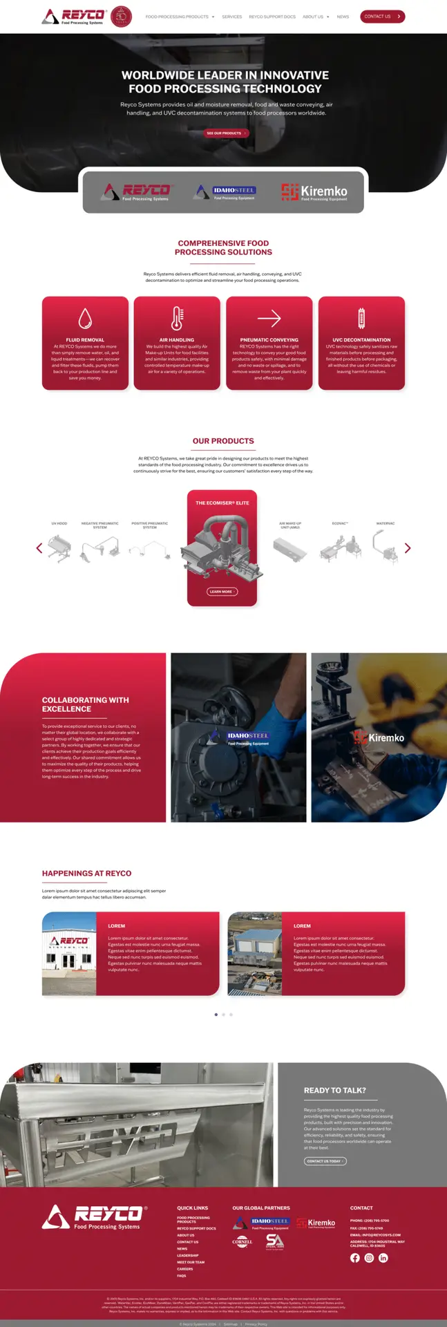 I designed a sleek and informative website for REYCO Systems, a leading provider of oil and moisture removal, pneumatic conveying, air handling, and UVC decontamination systems for the food processing industry. The layout conveys technical expertise and trust through structured organization, clear product categories, and prominent use of concise messaging, ensuring users can quickly understand complex industrial solutions.